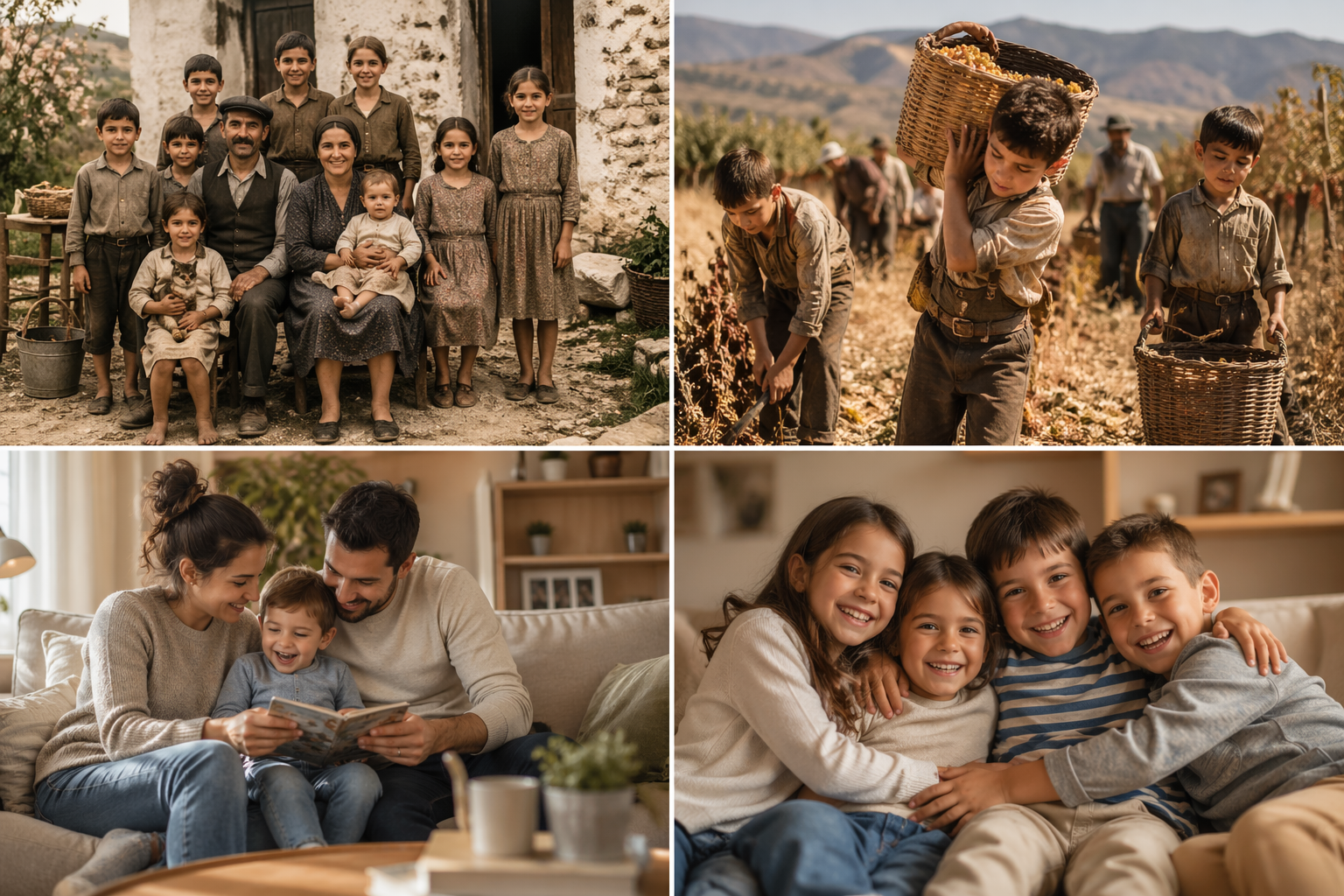Και, βέβαια, η Ελλάδα ήταν μια αγροτική χώρα. Τα παιδιά δεν ήταν μόνο παιδιά, ήταν και «χέρια». Σε χωριά και νησιά έβλεπες οικογένειες με οκτώ και δέκα παιδιά. Και αυτά τα παιδιά, από πολύ μικρά, συμμετείχαν στη ζωή της οικογένειας. Θυμάμαι, μικρός, εικόνες παιδιών στην ηλικία των δέκα ετών να κουβαλούν βάρη, να δουλεύουν, να μπαίνουν νωρίς στον ρόλο του «μεγάλου». Δεν υπήρχε το περιθώριο της παιδικότητας όπως το εννοούμε σήμερα.
